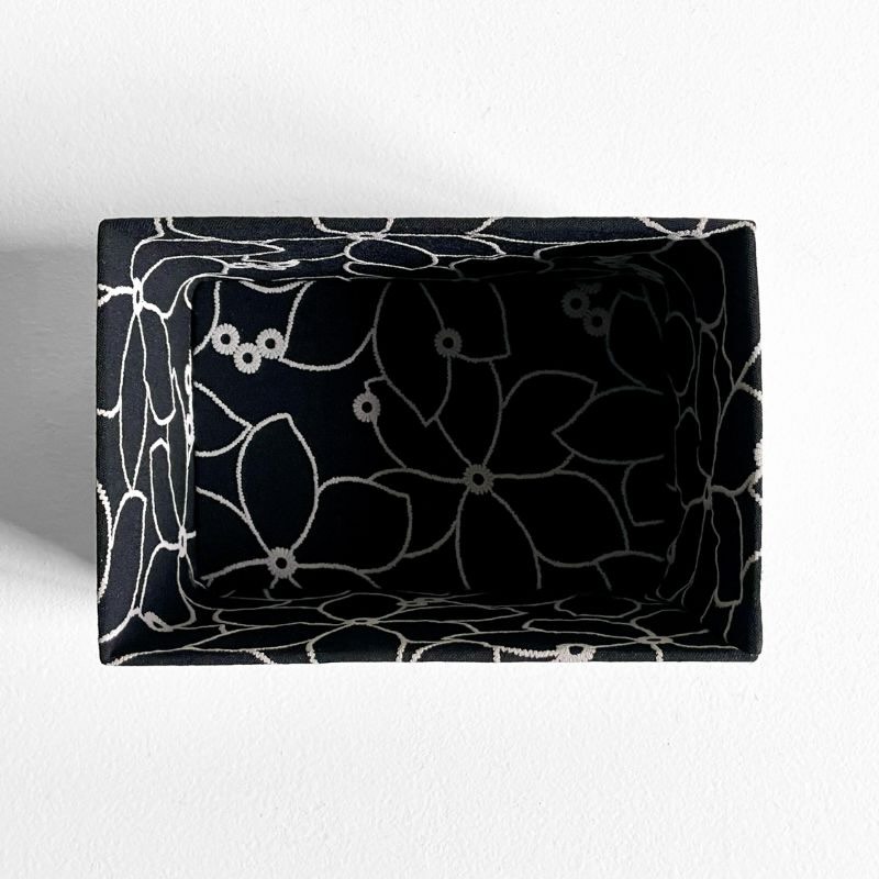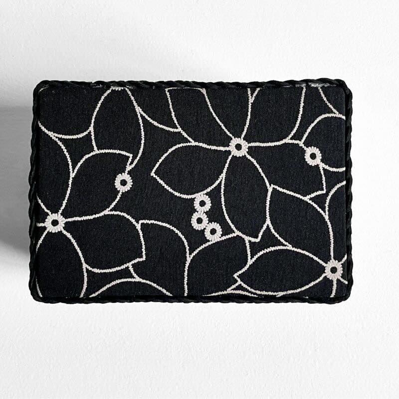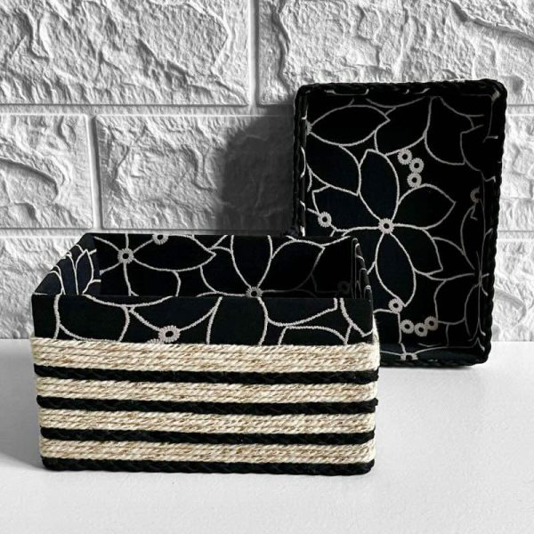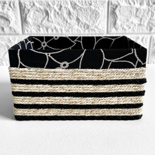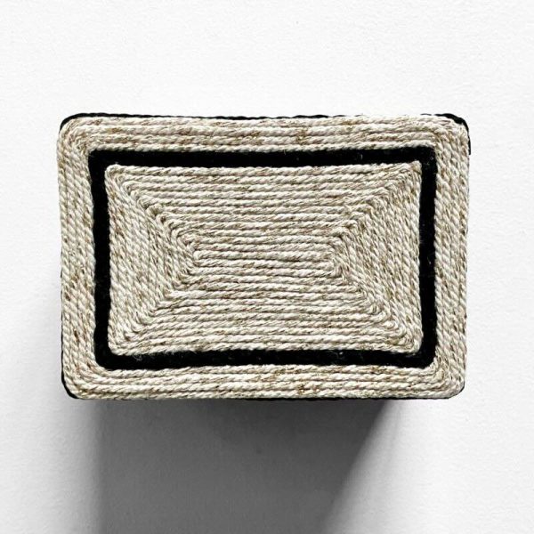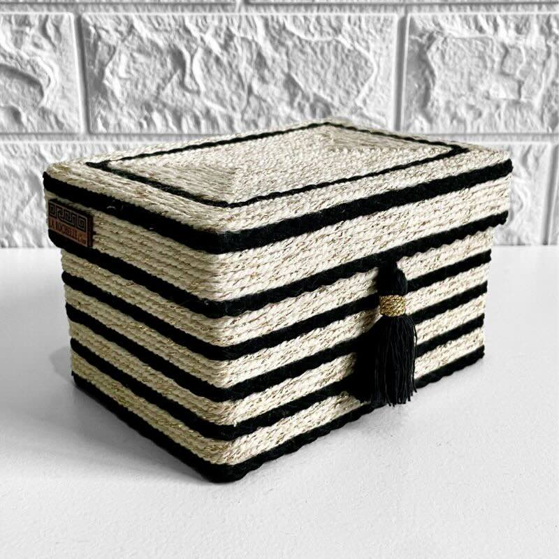 La caja Alba cuenta con una base de soporte estable y un exterior con acabado en cuerda en dos tonos: cuerda beige claro combinada con cuerda negra, aplicadas de forma artesanal. El interior está revestido con un tejido negro con bordados en tono beige, presente en el interior de la caja, en el interior de la tapa y en el fondo exterior, aportando una terminación coherente y cuidada.