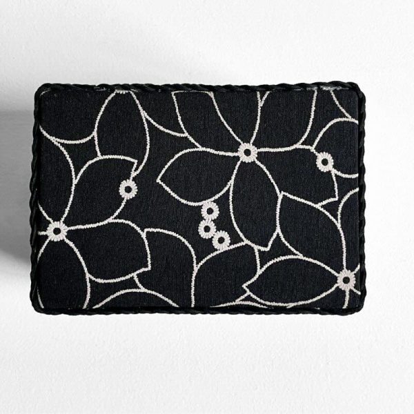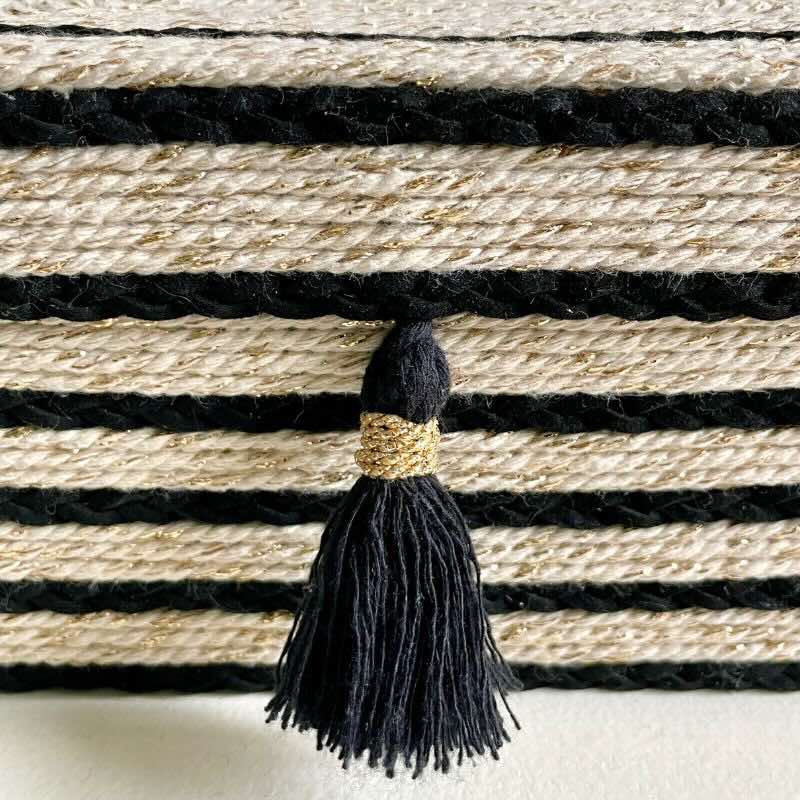 - Materia, refinamiento y detalle: El diseño de Alba se define por un exterior con acabado en cuerda que combina cuerda beige clara y cuerda negra, generando un contraste elegante y equilibrado. De forma sutil, un fino hilo dorado integrado en la cuerda beige aporta pequeños matices luminosos según la luz. En la fachada frontal, un elemento decorativo aplicado a mano incorpora un pompon negro con detalles dorados, añadiendo un acento discreto y sofisticado. En el interior, el revestimiento textil negro con bordados en tono beige introduce una sensación de profundidad y refinamiento. Este mismo tejido está presente en el interior de la caja, en el interior de la tapa y en el fondo exterior, reforzando una terminación coherente y cuidada, pensada para un uso cotidiano confortable.