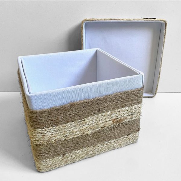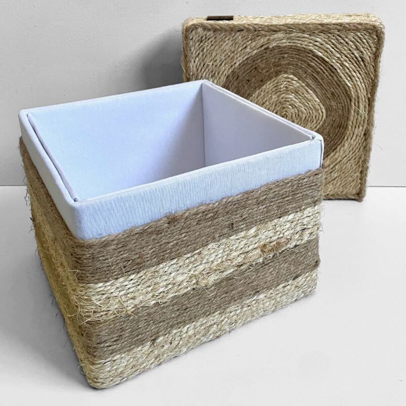 Una caja decorativa artesanal pensada para reunir y organizar objetos de uso cotidiano dentro de una estética sobria y orgánica.