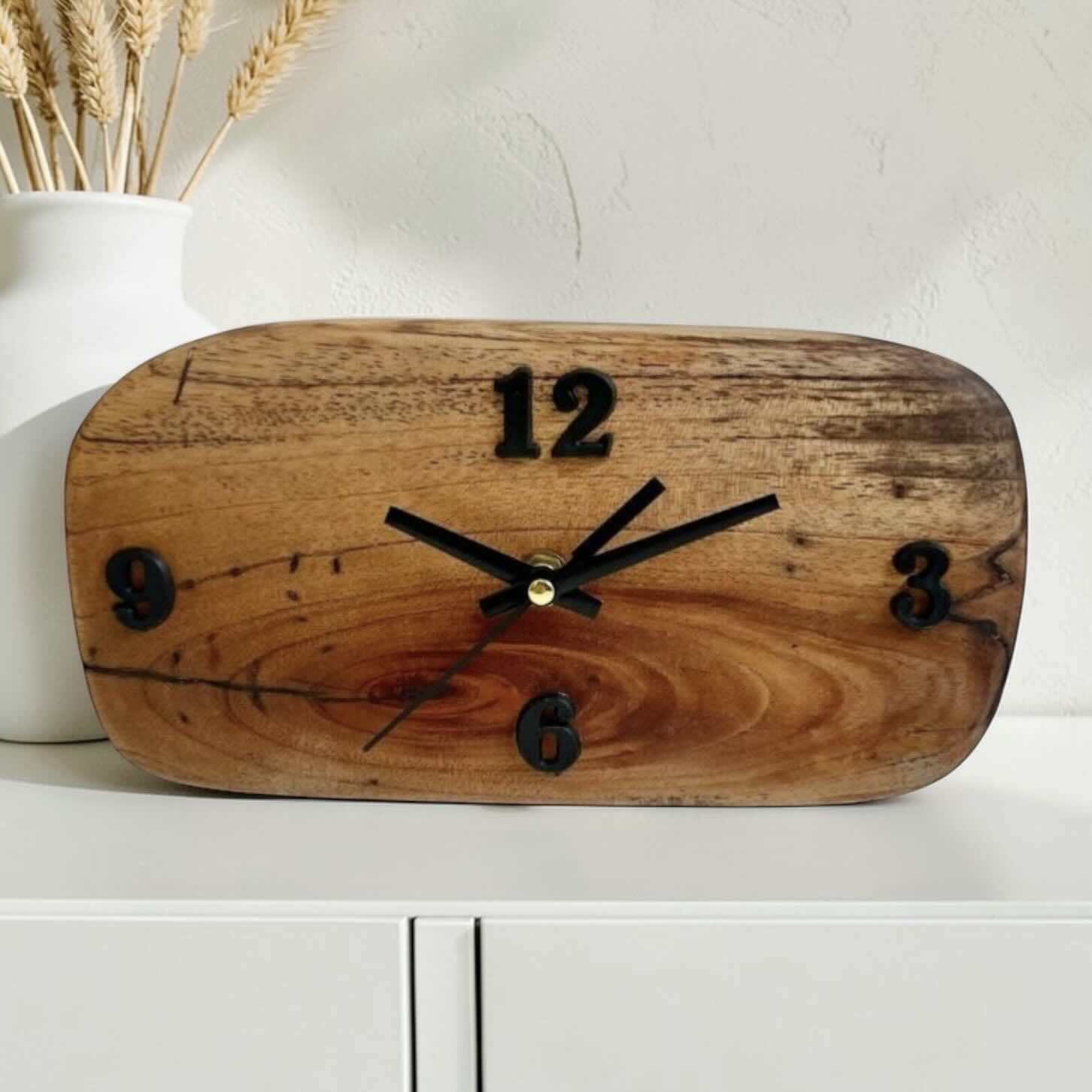 La identidad del reloj Quietud se construye a partir de una relación precisa entre materia, forma y detalle. La madera maciza, protegida con un acabado natural al aceite que realza el color y el veteado, aporta profundidad y sobriedad. Los números negros en relieve, situados en las posiciones 3, 6, 9 y 12, junto con las manecillas metálicas negras con un discreto detalle central dorado, introducen un contraste sutil que favorece una lectura clara y equilibrada del tiempo.