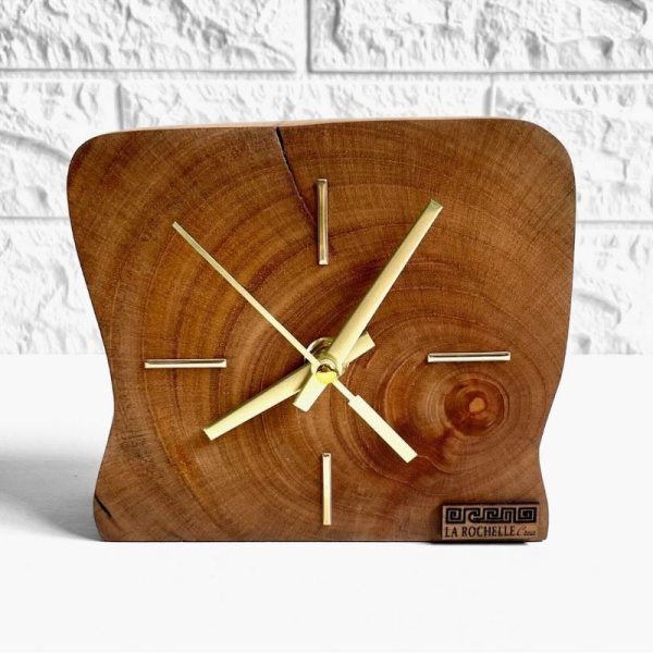La identidad del reloj Ritmo se define por la relación precisa entre materia y detalle. La madera maciza, protegida con un aceite de acabado que realza el color y el veteado natural, aporta profundidad y carácter. Los marcadores horarios dorados, situados en las posiciones 3, 6, 9 y 12, junto con las manecillas metálicas doradas de líneas limpias, introducen un acento luminoso y refinado que favorece una lectura clara y equilibrada del tiempo.